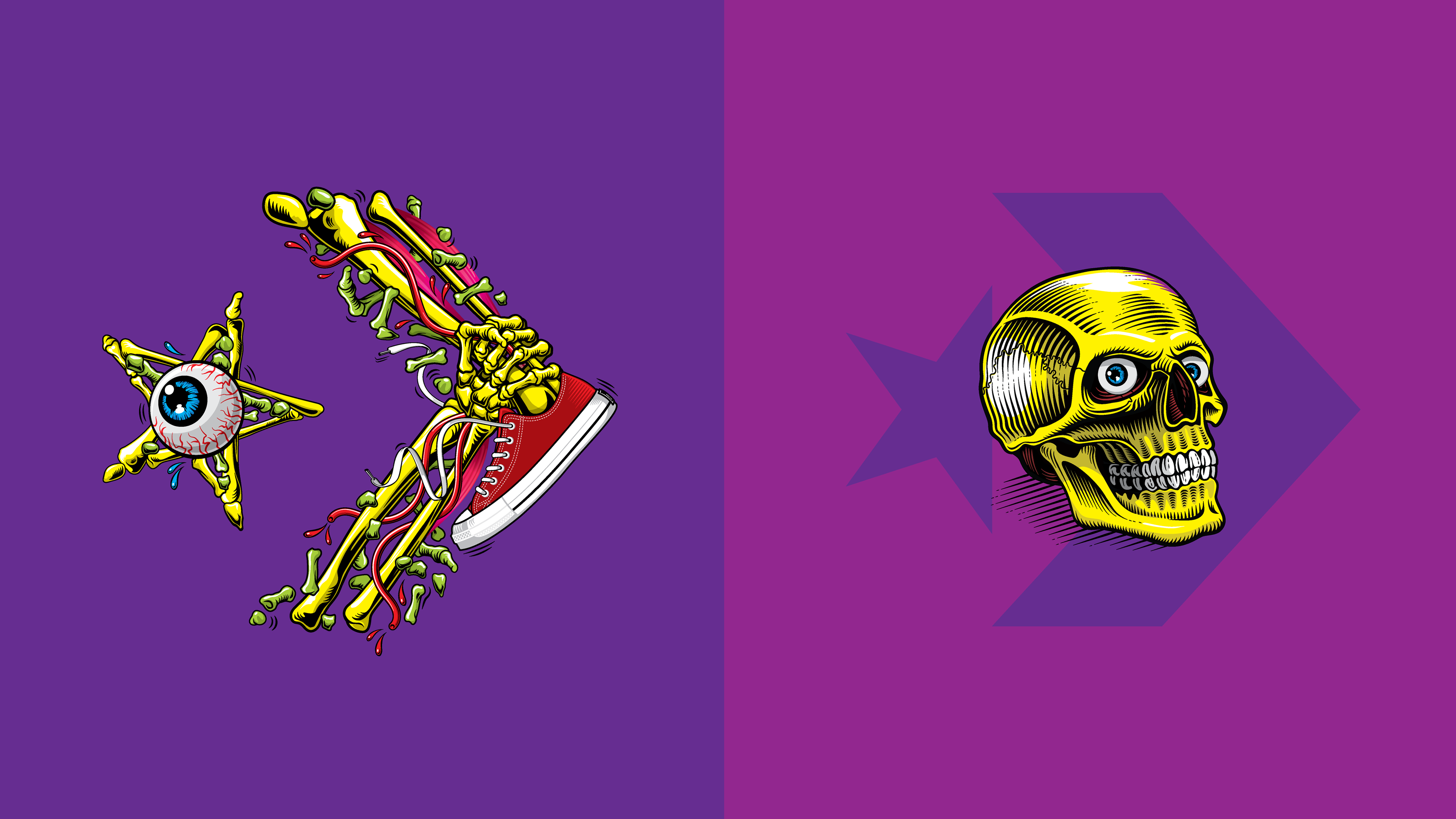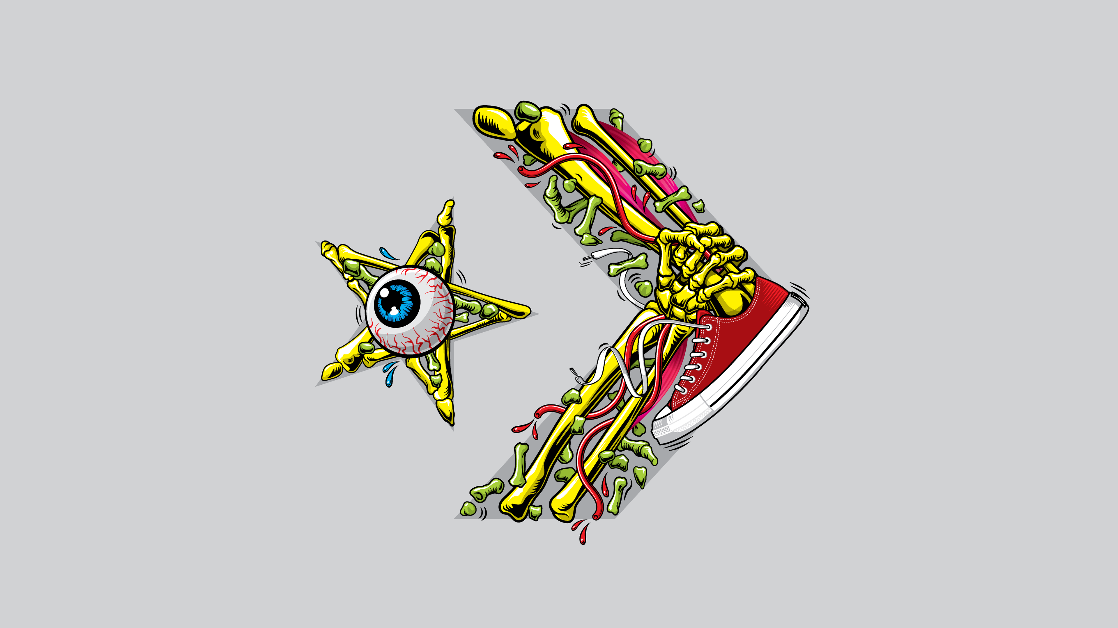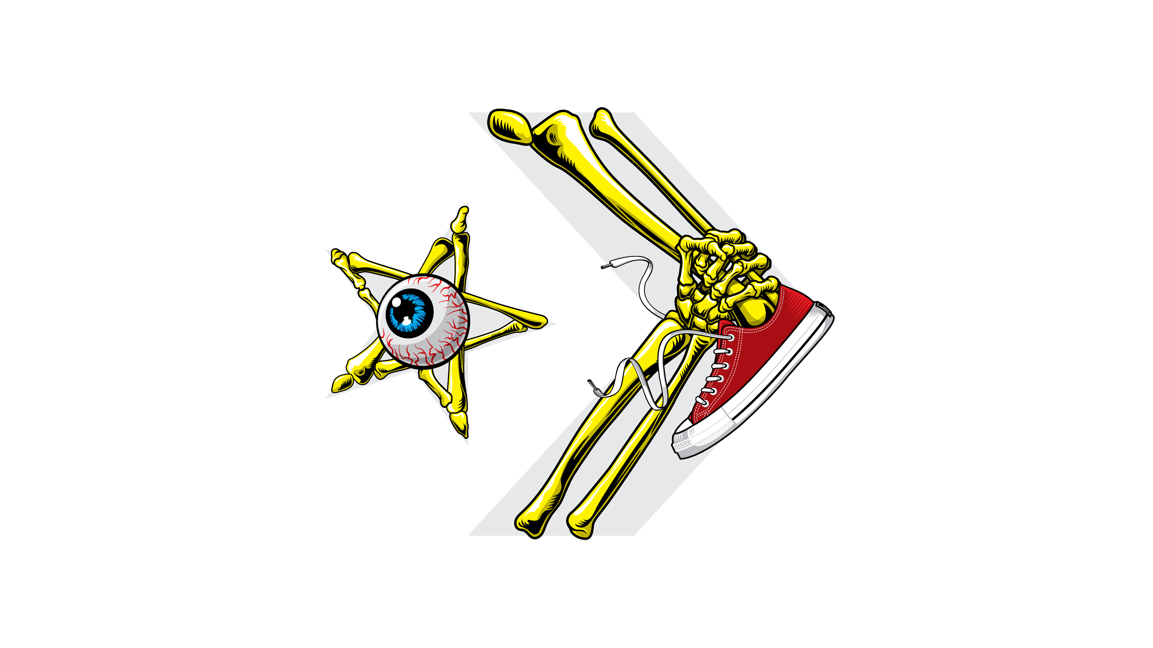 This is the second part of two proactive projects created for Converse. Following on from the the 'Skull Chevron' element, was to create a design inspired by the late 80's/early 90's skateboard art. The idea of a skeleton leg (still wearing Converse sneaker) being held by the lower arm, forming the 'chevron' icon was completed with an eyeball and more bones, forming the accompanying star. Then all the extra bones, veins and muscles were added to give it that 90's 'Snot Art' feel. This illustration was created in Adobe Illustrator as a full vector design, again with colours and other elements (like the skull) being added, to create variation for multiple clothing applications.