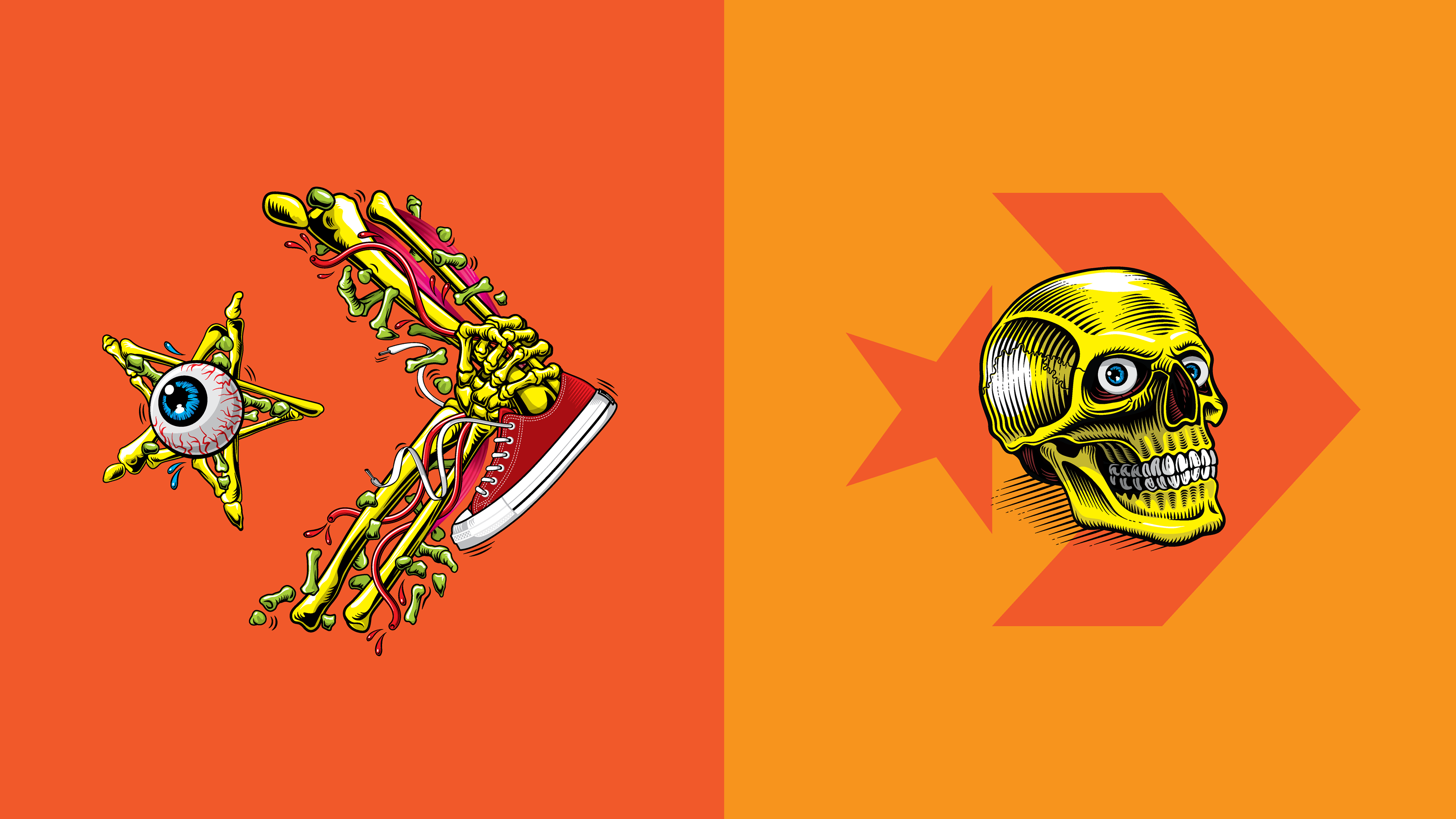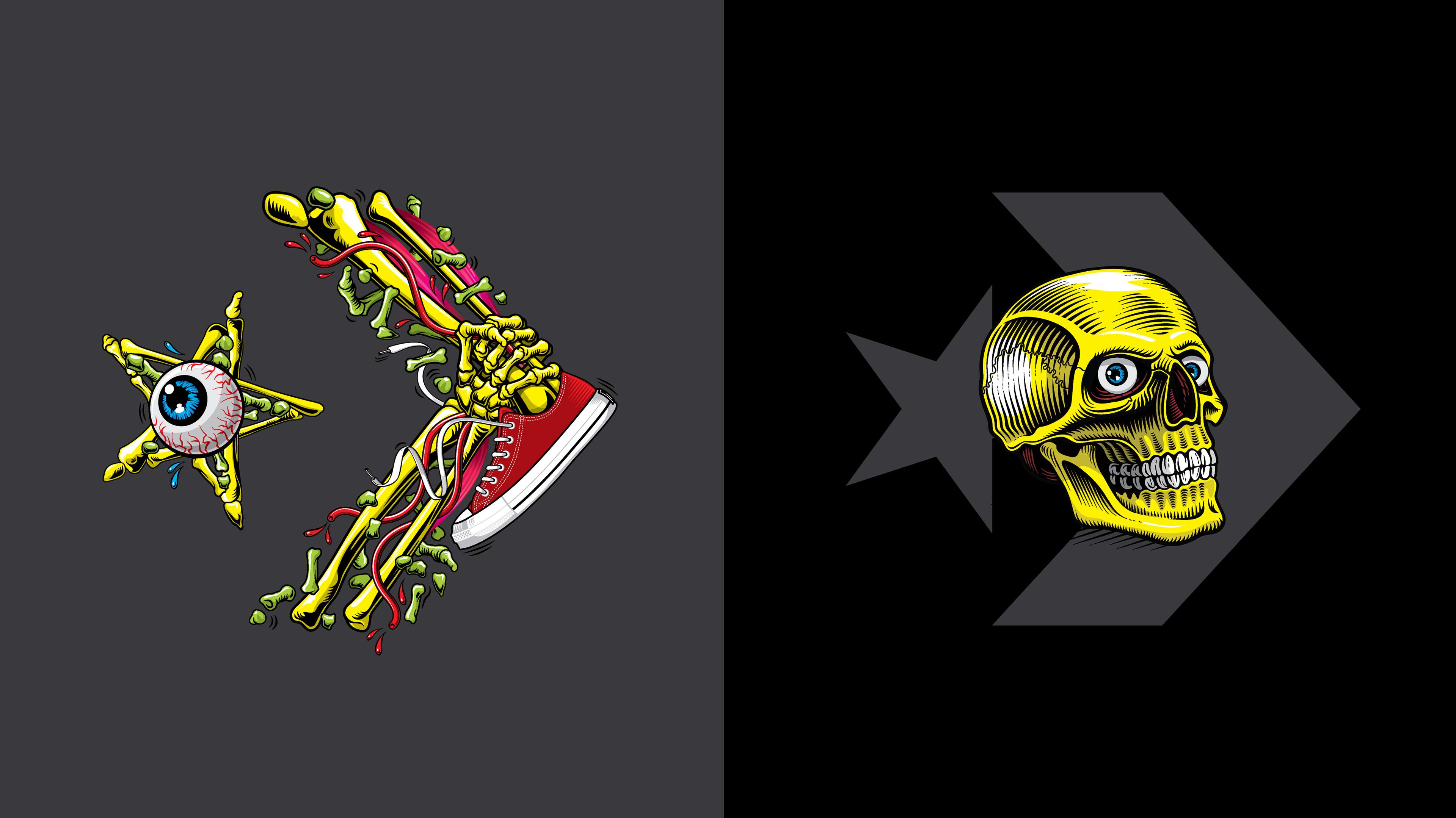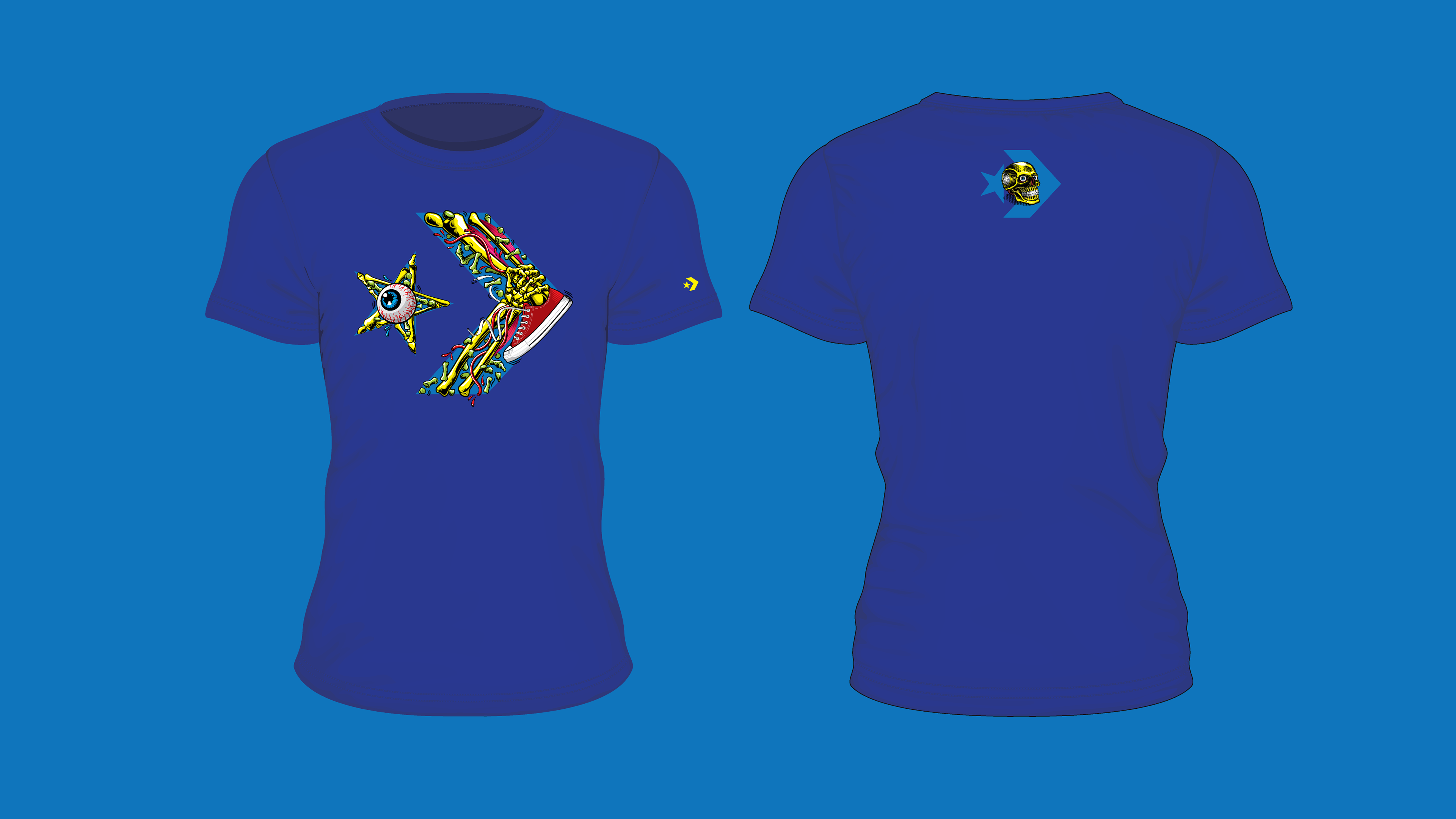 This is the second part of two proactive projects created for Converse. Following on from the the 'Skull Chevron' element, was to create a design inspired by the late 80's/early 90's skateboard art. The idea of a skeleton leg (still wearing Converse sneaker) being held by the lower arm, forming the 'chevron' icon was completed with an eyeball and more bones, forming the accompanying star. Then all the extra bones, veins and muscles were added to give it that 90's 'Snot Art' feel. This illustration was created in Adobe Illustrator as a full vector design, again with colours and other elements (like the skull) being added, to create variation for multiple clothing applications.