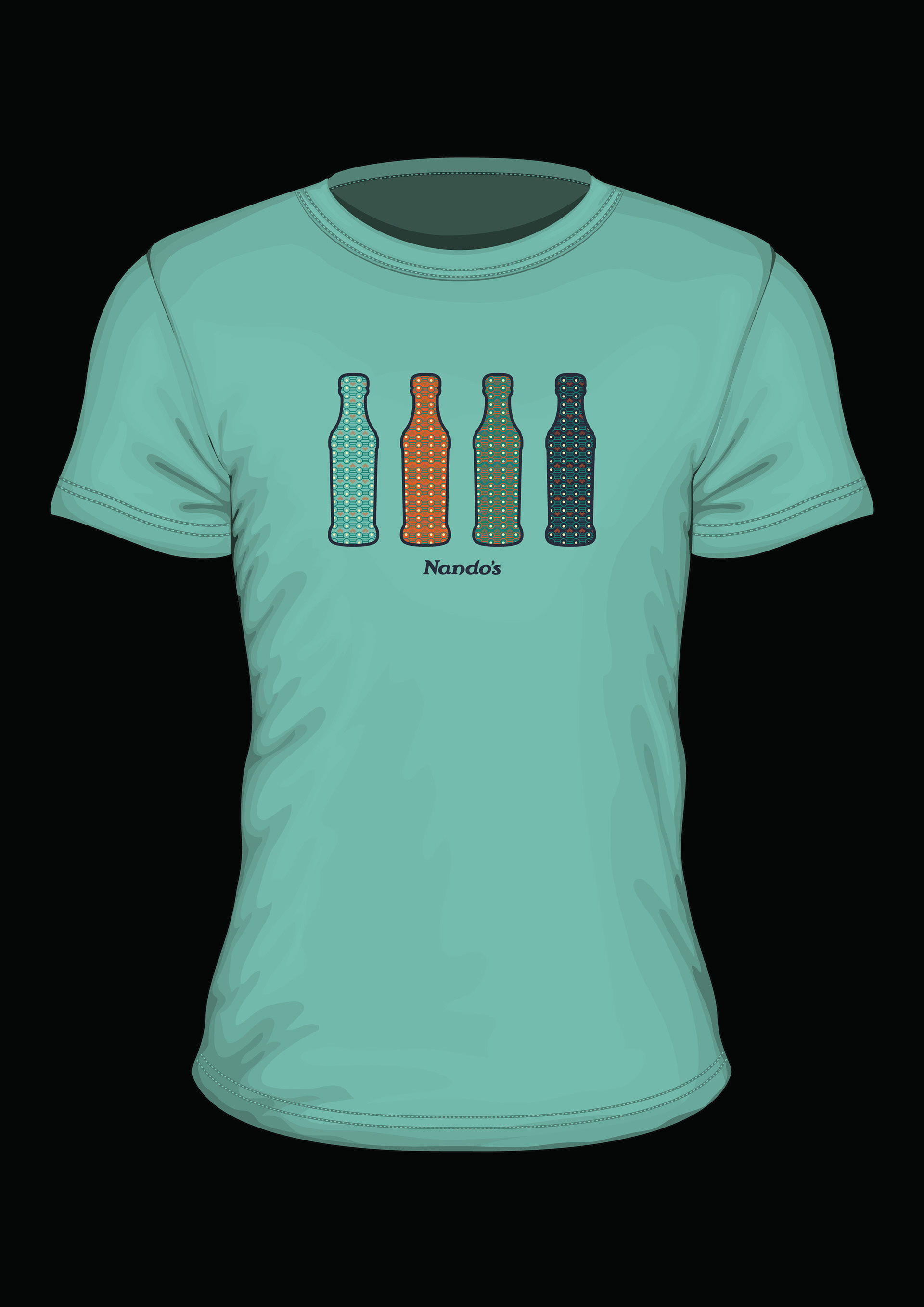 Nando's briefed us to create a striking tee-shirt design, using one of their custom patterns they had designed. We had to incorporate this pattern in different shades, directions and size, within a flame-type shape that was 'exploding' out of one of their sauce bottles. This was used on the back of the shirt. The front of the shirt had the bottle shape repeated with the pattern - in different colours - making up the bottle shapes.