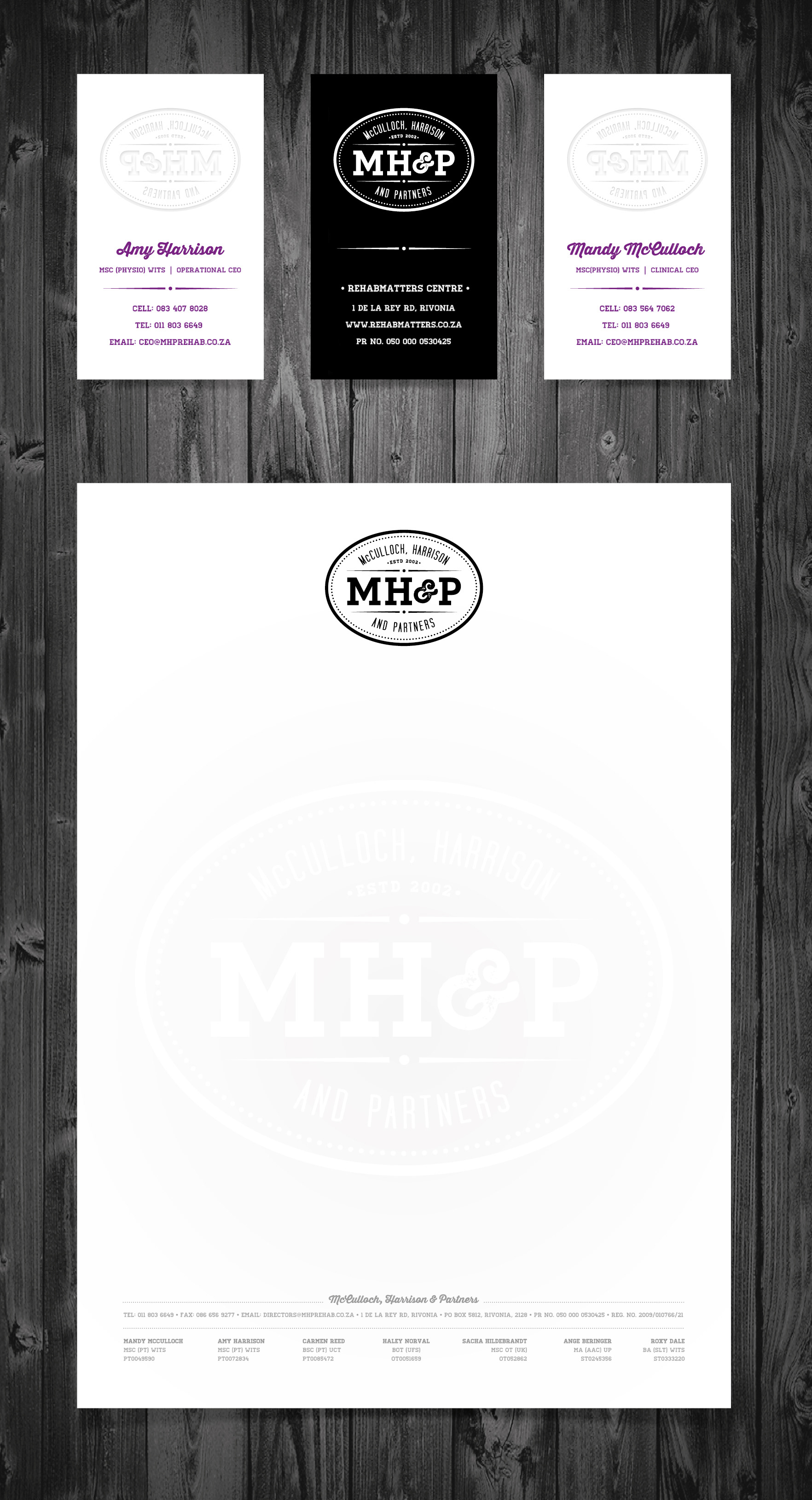 This is a recent logo for a new company of therapists who have banded together to form a new entity. They each had their own sentimental workways and nostalgia, which we had to incorporate somehow. Thus the idea of a “retro stamp” with an “established date”, which seemed appropriate. Shown here are the various ways in which the logo can be used - from outlined to solid and on different backgrounds. With regards to the corporate identity elements, the idea of an embossed single-colour printed business card (with all the generic information pre-printed on the front) but all individual details applied on the reverse (with an actual ink stamp) proved a unique but effective execution. The letterheads and email signatures were clean and simple layouts that combined function with design as we had to incorporate seven different directors names and qualifications. We also had to create uniforms - from every day work tops, scrubs for hospital visits to jackets. The vintage and retro theme was carried through to these applications by using similar designs found in baseball and football kit. Also included below, are some of the semi-final "W.I.P." options of the logo.