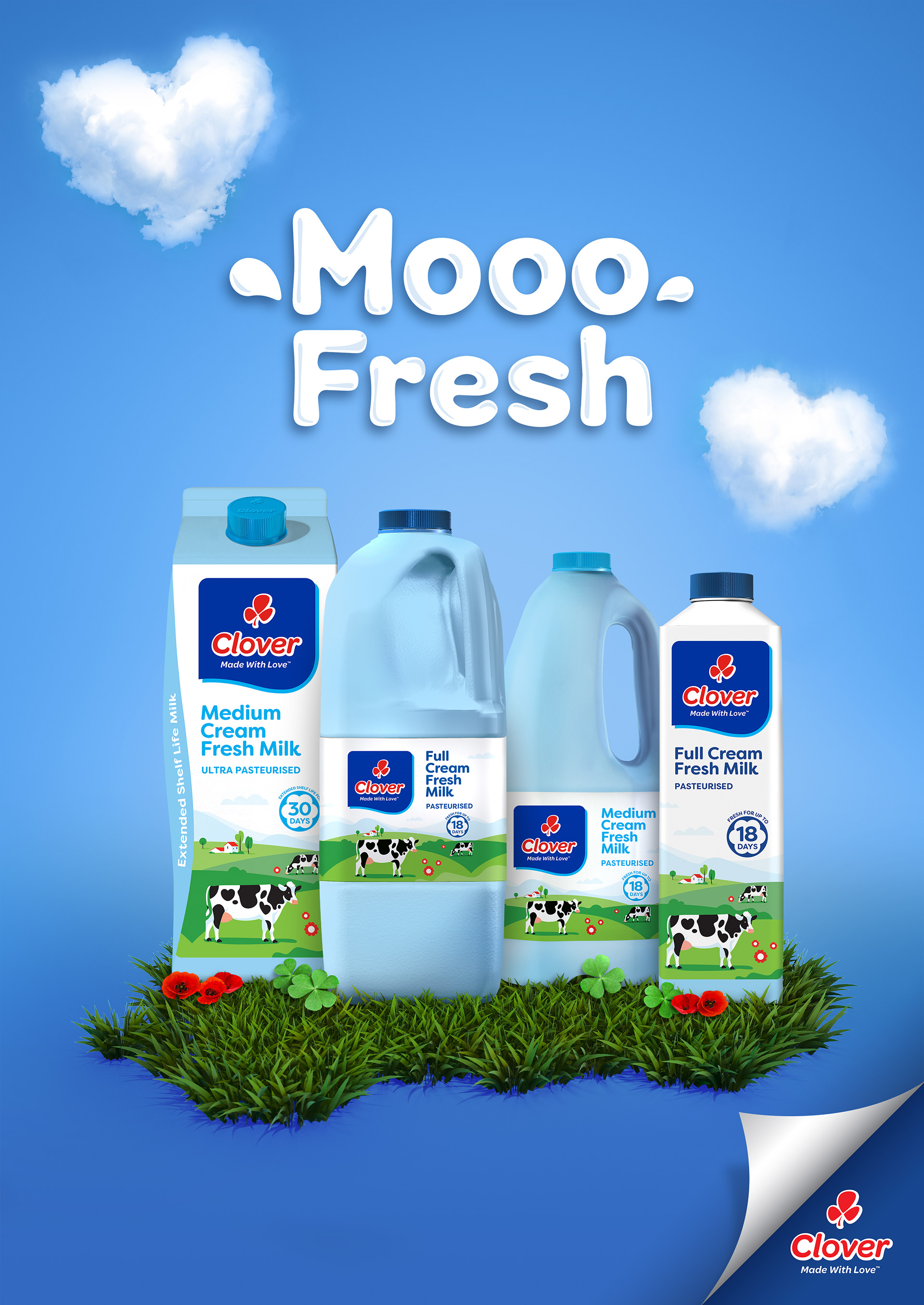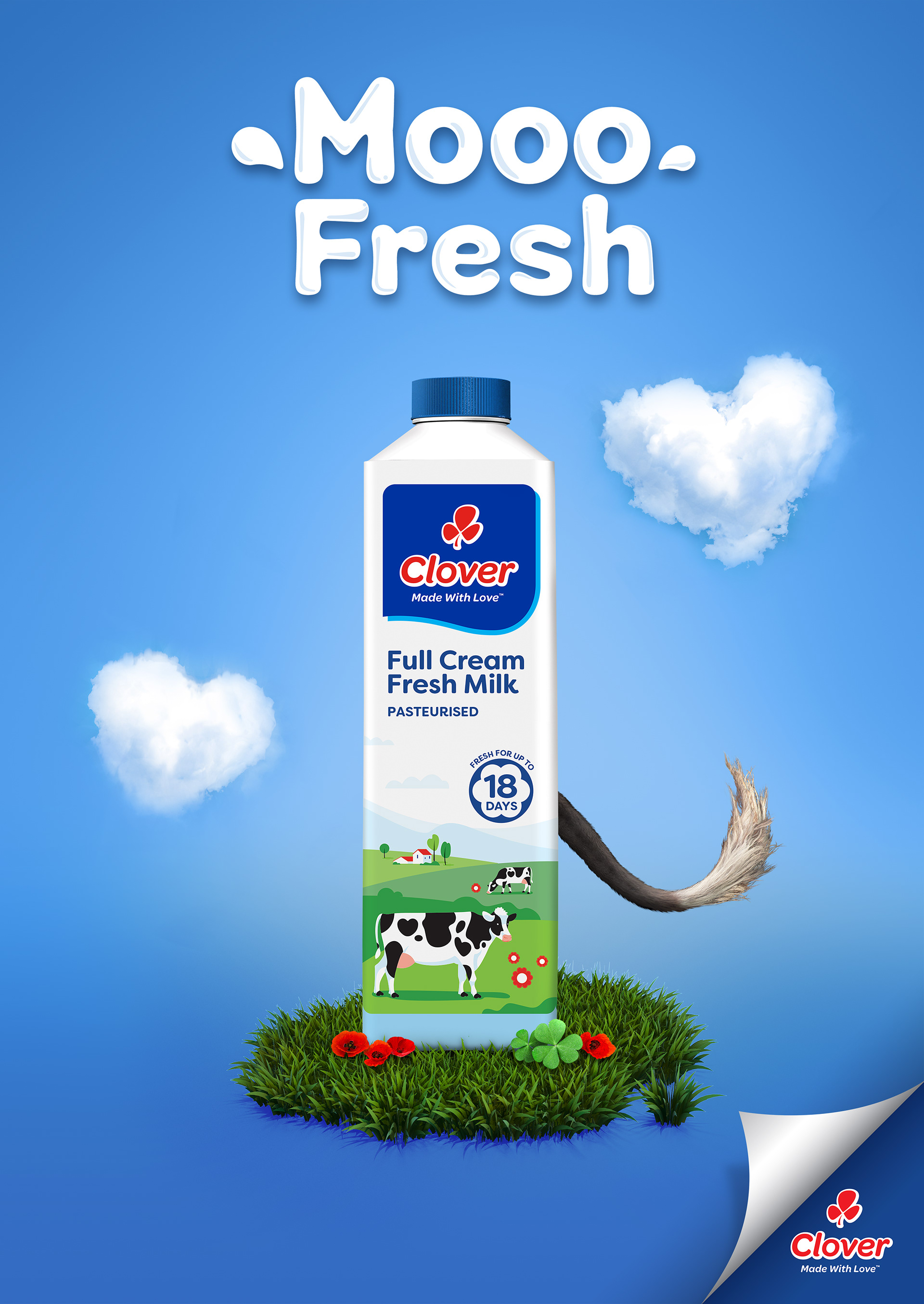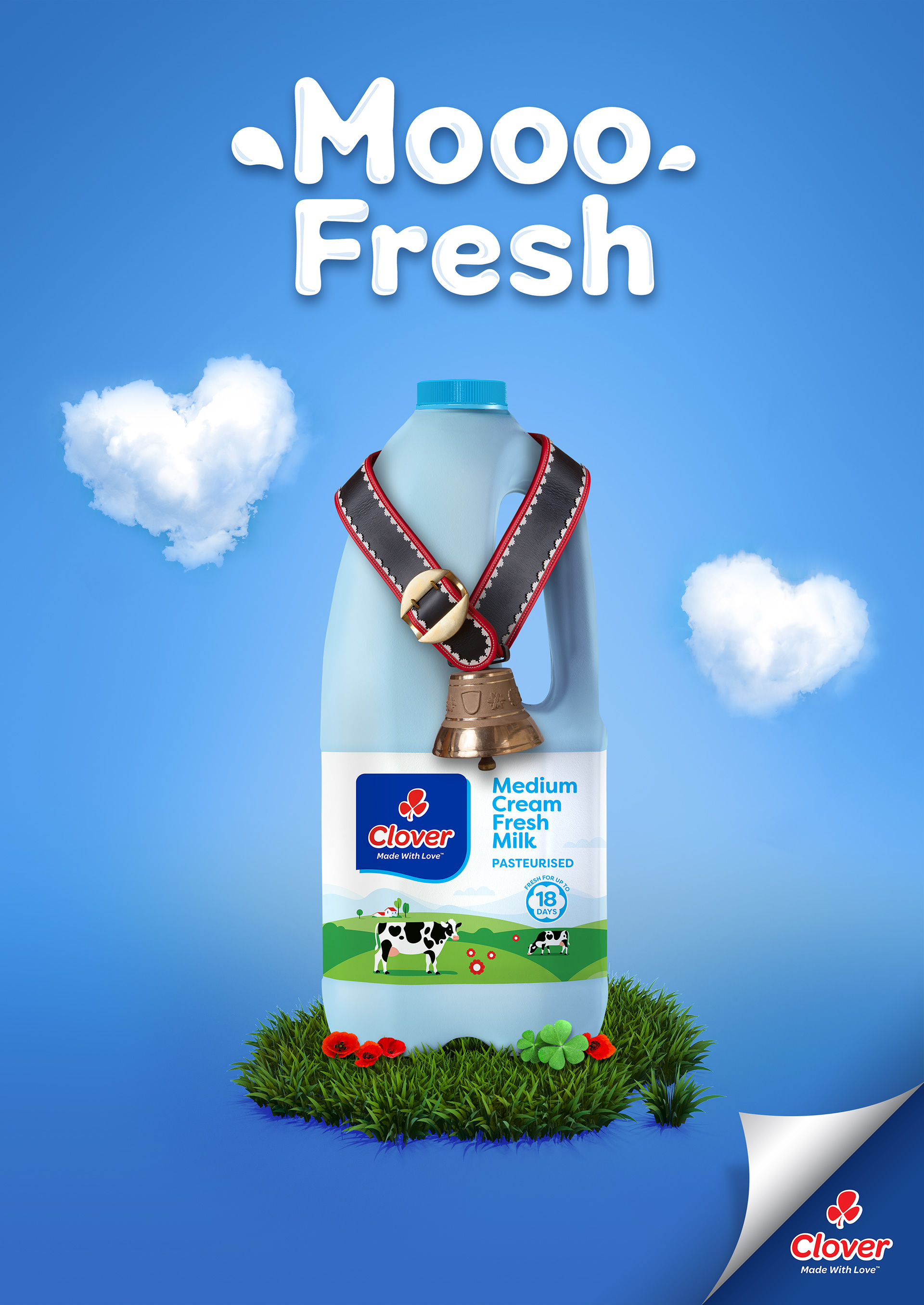 Using the funky 'Mooo Fresh' logo supplied, we were asked to create a few striking key visual layouts advertising the new Clover-branded milk packaging, accentuating the 'cow-fresh' quality of the milk inside the new packs!